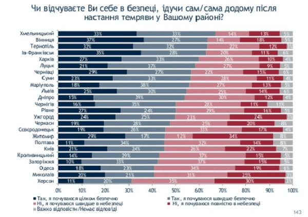 Наибольший процент жителей, которые чувствуют себя в безопасности, находится в Виннице – 37%. Наименьший — в Запорожье (10%).