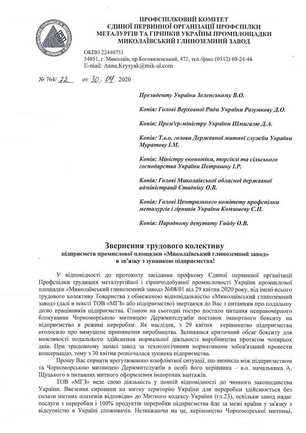 Также копии обращения отправили главе Верховной Рады Дмитрию Разумкову, премьер-министру Денису Шмыгалю, министру развития экономики, торговли и сельского хозяйства Игорю Петрашко, врио главы Государственной таможенной службы Игорю Муратову, главе Центрального комитета профсоюза металлургов и горняков Сергею Комышеву, народному депутату Александру Гайду, главе Николаевской ОГА Александру Стаднику.