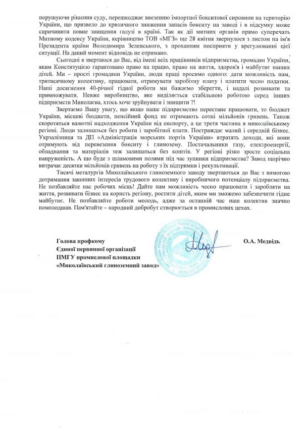 «Обращаем ваше внимание, что если наше предприятие перестанет работать, то бюджет Украины, местные бюджеты, Пенсионный фонд не получат сотни миллионов гривен. Также сократятся валютные поступления Украины от экспорта, а это третья часть в николаевском регионе. Люди останутся без работы и заработной платы. Пострадает малый и средний бизнес. «Укрзализныця» и ГП «Администрация морских портов Украины» потеряют доходы, которые они получают от перевозки боксита и глинозема. Поставщики газа, электроэнергии, оборудования и материалов тоже останутся без средств. В регионе резко возрастет социальная напряженность. А что будет со шламовыми полями во время остановки предприятия? Завод ежегодно тратит десятки миллионов гривен на работу по их поддержке и рекультивации».