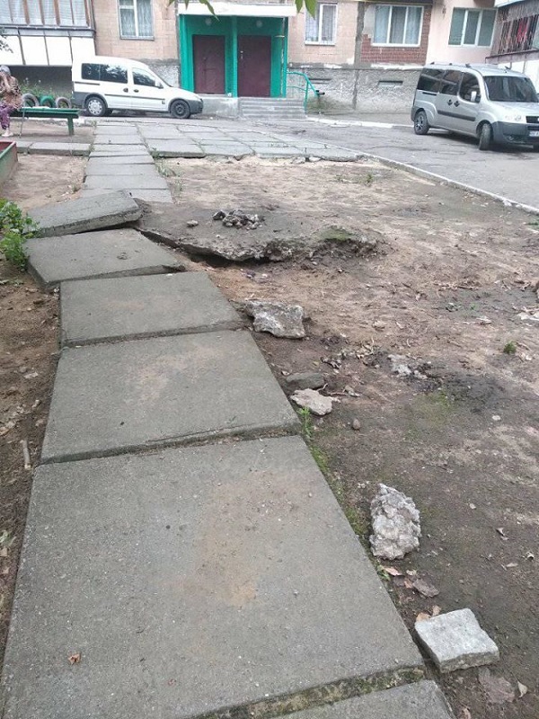 «Корабельный район, двор по ул. Айвазовского, 11б-в. После выкорчевывания тополя, растущего во дворе близко от дома (к слову, совершенно здорового, в отличие от абсолютно всех других сухих тополей, окружающих двор, и полного игнорирования заявлений об их кронировании) работниками были разворочены плитки, составляющие дорожку. Остатки пня были убраны (спасибо!), но по дорожке пройти нельзя.