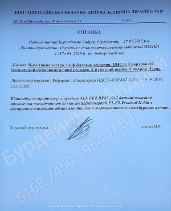 «Андрюша с рождения требовал особой опеки, часто болел, но ни смотря ни на что, никто подумать не мог, какая страшная болезнь ждет его в будущем. 1,5 года назад ему поставили диагноз – острый лимфобластный лейкоз (рак крови). 9 месяцев с небольшими перерывами проходило лечение в детском отделении онкогематологии г. Николаева после чего наступил период ремиссии, но к сожалению, он длился не долго. В июне этого года у Андрюши случился ранний рецидив. И обратно все началось по новой: больничные стены, капельницы, пункции, новые блоки химии…», — сказано в письме, которое пришло на почту «Корабелов.Инфо».