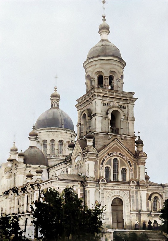 Золочений хрест висотою 3,5 м вінчав верхівку дзвінниці. Храм мав 24 куполи. Внутрішнє оздоблення викликало захват, при церкві діяла церковно-приходська школа. Удари величезного дзвону церкви було чути за дванадцять кілометрів.