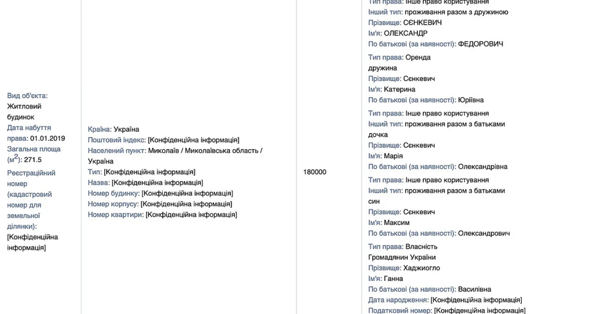 Что касается Анны Хаджиогло, которой разрешили подготовить документы для дальнейшего получения права собственности на землю, то человека с таким именем и фамилией можно найти в декларации Александра Сенкевича за 2020 год. В частности, Сенкевич задекларировал, что его супруга Екатерина арендует у Анны Хаджиогло частный дом на 271.5 квадратных метра. В 2020-ом году аренда дома обошлась в 180 тысяч гривен (15 тысяч гривен в месяц).