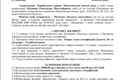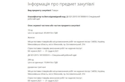 В июне 2021 г.а администрация Корабельного района г. Николаева опубликовала на портале Prozorro отчет о закупке (без проведения торгов) спецодежды на общую сумму в 3440 гривен. Договор на поставку был заключен с ФОП Матюхина Людмила Анатольевна.