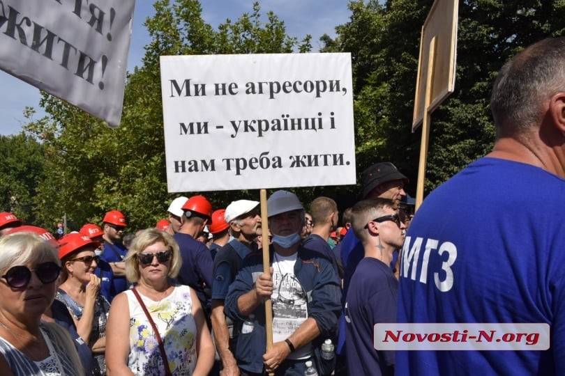 Заводчане сняли каски и стали ими стучать, скандируя: «НГЗ!». В ответ активисты кричат: «Дерипаску геть!».