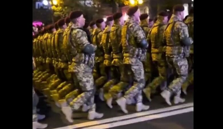При этом бойцы ВСУ шли строевым шагом и под барабанный бой. В Киеве во время репетиции военного парада, который состоится на День Независимости, военнослужащие хором исполнили припевку о российском президенте Владимире Путине, сообщает УНИАН со ссылкой на соцсети.