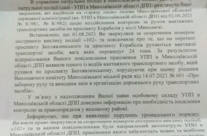 »У зв’язку з надходженням Вашої заяви, особовому складу УПП в Миколаївській області Департаментом патрульної поліції доведено інформацію про необхідність посилення контролю за правопорядком у вказаному районі», — добавили в ответе.