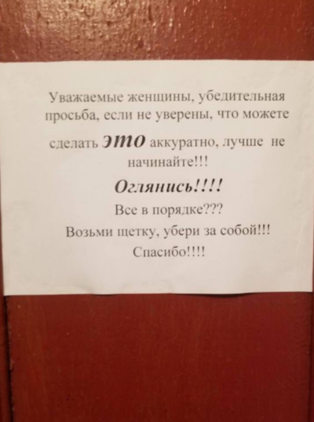 «Уважаемые женщины, убедительная просьба, если не уверены, что можете сделать это аккуратно, лучше не начинайте! Оглянитесь! Всё в порядке? Возьми щётку, убери за собой! Спасибо!», – сказано в обращении.