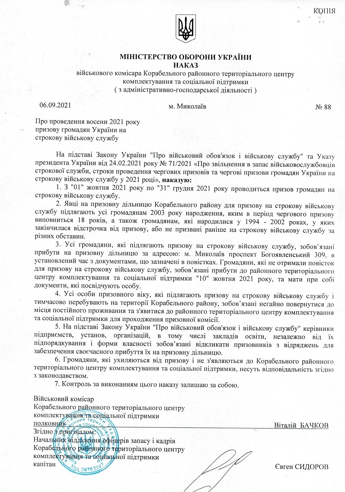 Доводимо до всіх мешканців Корабельного району копію наказу військового комісара Корабельного районного територіального центру комплектування та соціальної підтримки, про проведення чергового призову на строкову військову службу восени 2021 року: