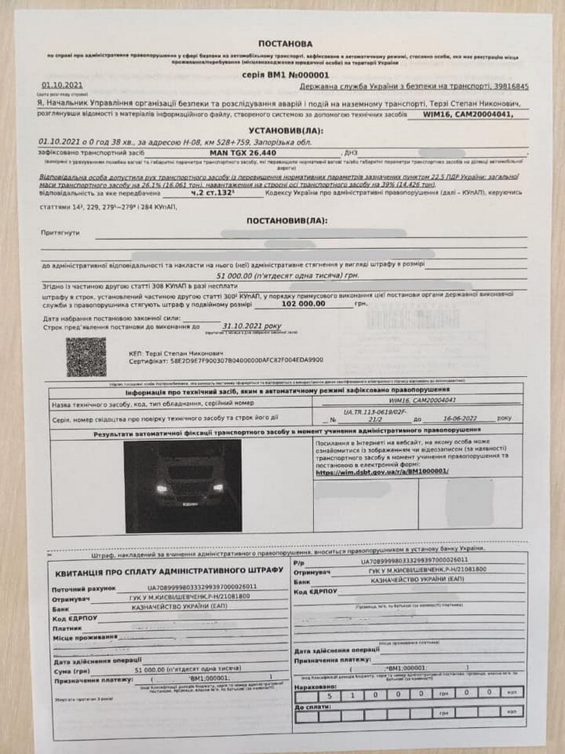 «1 октября, в 00:38 на дороге Н-08 Запорожской области, WIM-комплекс зафиксировал ТС с превышением установленных габаритно-весовых норм общей массы на 16 тонн и нагрузкой на строенные оси на 14 тонн».