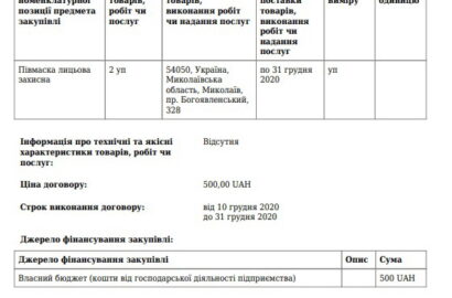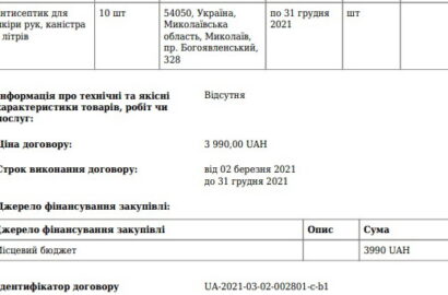 Согласно общедоступным данным портала «Прозорро», ДК «Корабельный» заключил (без проведения торгов) 7 договоров, потратив на закупку защитных масок и дезсредств 21185,40 грн. (два договора в декабря 2020 г. (почти на 1,7 тыс. грн) и пять договоров в марте 2021 года (почти на 19,5 тысяч грн).