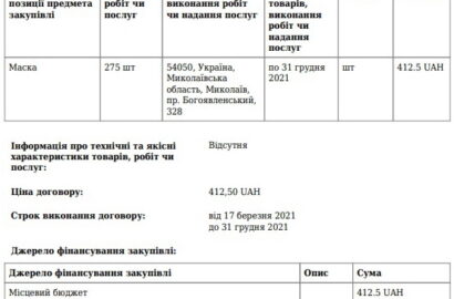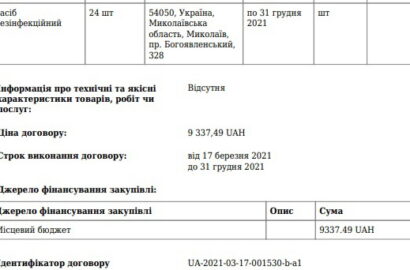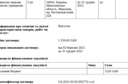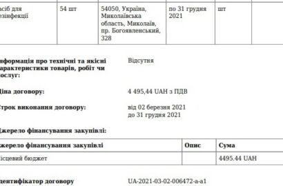 А на сумму в 9750 грн ФЛП Борик Светлана Михайловна, также проживающая в столице, до конца 2021 года должна поставить 24 единицы дезинфекционного средства по 389,06 грн. «за штуку» и 275 масок по 1,5 грн.: