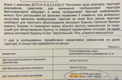 Стахурский также сослался на план «разделения территории для выделения придомовой территории для обслуживания многоквартирного дома №79-А по ул. Тернопольской (ОСМД «БАЛТЕР-79А)». В одном из пунктов документа значится, что минимальная расчетная площадь земельного участка для обслуживания этого дома составляет 5401 кв. м. Но окончательно принятая площадь — 8304 кв. м, что само по себе немало.