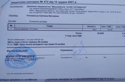 По проспекту Корабелов, 14 (возле пиццерии «Челентано») продавцом зеленых красавиц, поставляемых из частного хозяйства, расположенного на территории земель Галицыновского сельсовета, журналисту были предоставлены для ознакомления договор предпринимателя, выращивающего примерно 60 тысяч деревьев породы «Сосна крымская», с КП «Обрій-ДКП» (на период действия с 15 по 31 декабря 2021) на вывоз мусора от деятельности ФЛП по адресу пр. Корабелов, 14 (одно место); а также акт Госэкоинспекции по результатам проверки соблюдения требований природоохранного законодательства на земельном участке, где выращиваются эти сосны, датированный 14.12.2020 (согласно документу, год назад там не было выявлено нарушений). А вот с чипами для сосен здесь, как оказалось, — тоже проблема.