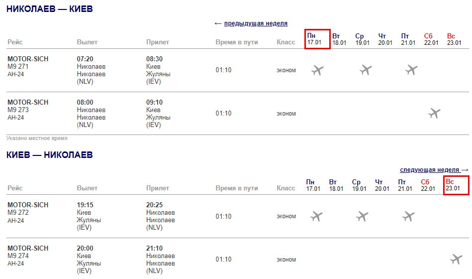 Новые рейсы будут отправляться из Киевского аэропорта имени Игоря Сикорского (Жуляны) по понедельникам, средам и пятницам в 19:15, а по воскресеньям — в 20:00. Рейсы из Николаева в Киев будут выполняться с 17 января по понедельникам, средам и пятницам в 7:20, а по субботам — в 8:00. Время в полете составляет 1 час 10 минут, а само направление будут обслуживать самолеты Ан-24.