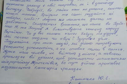 Третього червня ми проводили збори мешканців, куди запросили Горбенко Н., вона не приїхала, на мої дзвінки не відповідала. Написала, що скоро відкриється пункт видачі на вул. Фонтанній, 2, потім виправила на 6, а пізніше, вже 5 червня, з’ясувалось, що це провулок Фонтанний, 6. Але це все одно не дуже зручно нашим інвалідам та одиноким стареньким людям. По перше — йти туди довше, та й чергу разом з сусіднім мікрорайоном треба вже буде вистоювати. Це говорить про те, що люди за Горбенко віддали в свій час голоси, а вона навіть не орієнтується в мікрорайоні, то як же вона можете слугувати народу. Питання стоїть в чому: за картками колективно видати прод. набори, а ми роздаємо за цими ж картками громадянам. Але нас не чують».