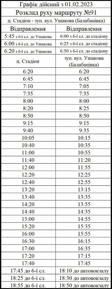 На маршруті №91 (Центральний стадіон – Балабанівка) автобуси зі стадіону розпочинають рух о 05:45 ранку, а з Балабанівки останні рейси відповідно стартують із кінцевих зупинок о 18:55 (до 6-ї Слобідської) та о 18:50 (до автовокзалу).