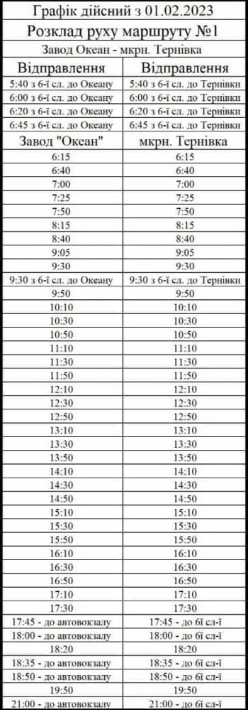 У зв’язку з цим було змінено графіки роботи автобусів. Так, на маршруті №1 (Завод “Океан” – Тернівка) вони починають обслуговувати городян із 05:40, а останні рейси стартують із кінцевих зупинок о 21:00.
