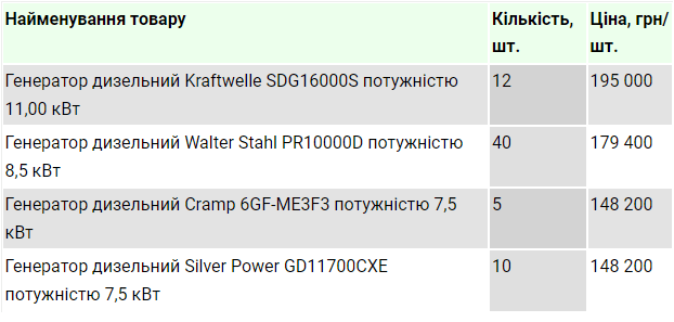 Найдорожчими є 12 дизельних генераторів Kraftwelle SDG16000S потужністю 11,00 кВт по 195 тис. грн. В інтернет-магазинах їх можна знайти під замовлення за 138 тис. грн, або в наявності за 164-199 тис. грн. Решту дві замовлені моделі не вдалося знайти в продажу.