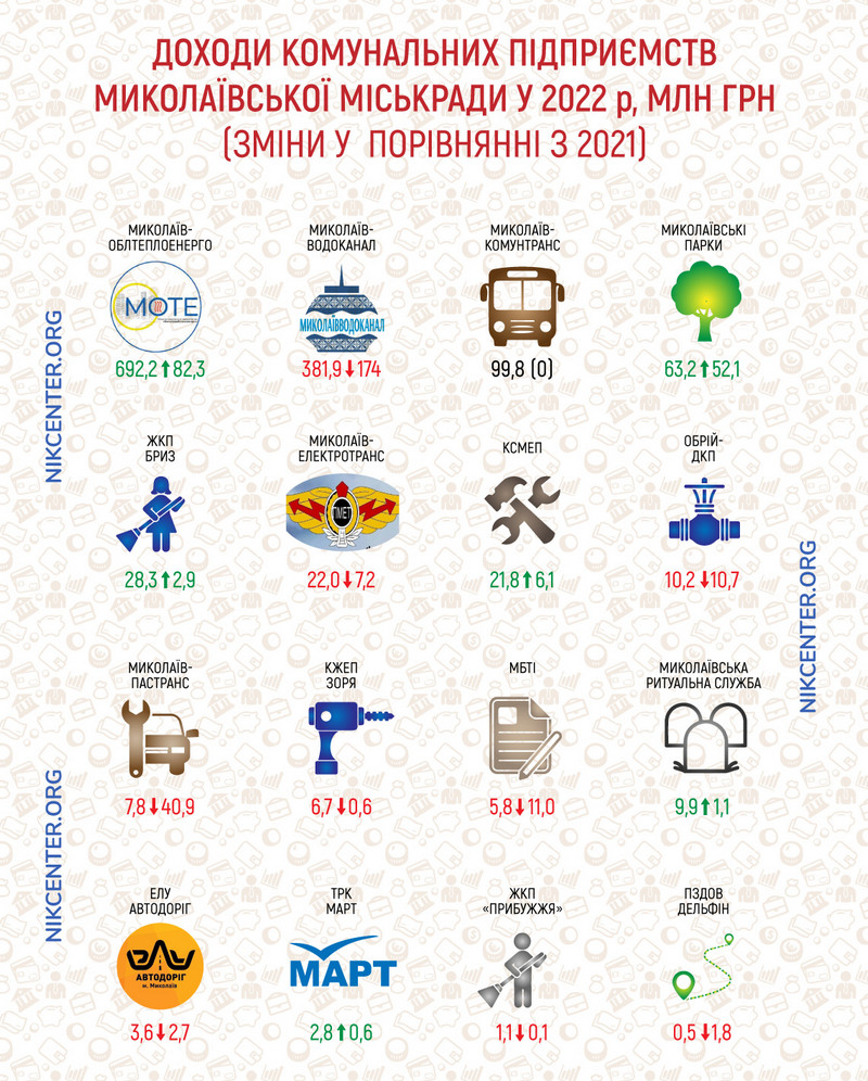 Але найбільшого росту доходів домоглося КП «Миколаївські парки». За рік війни дохід підприємства збільшився в шість разів, ніж був до війни: 63,2 млн грн проти 11,1 млн грн.
