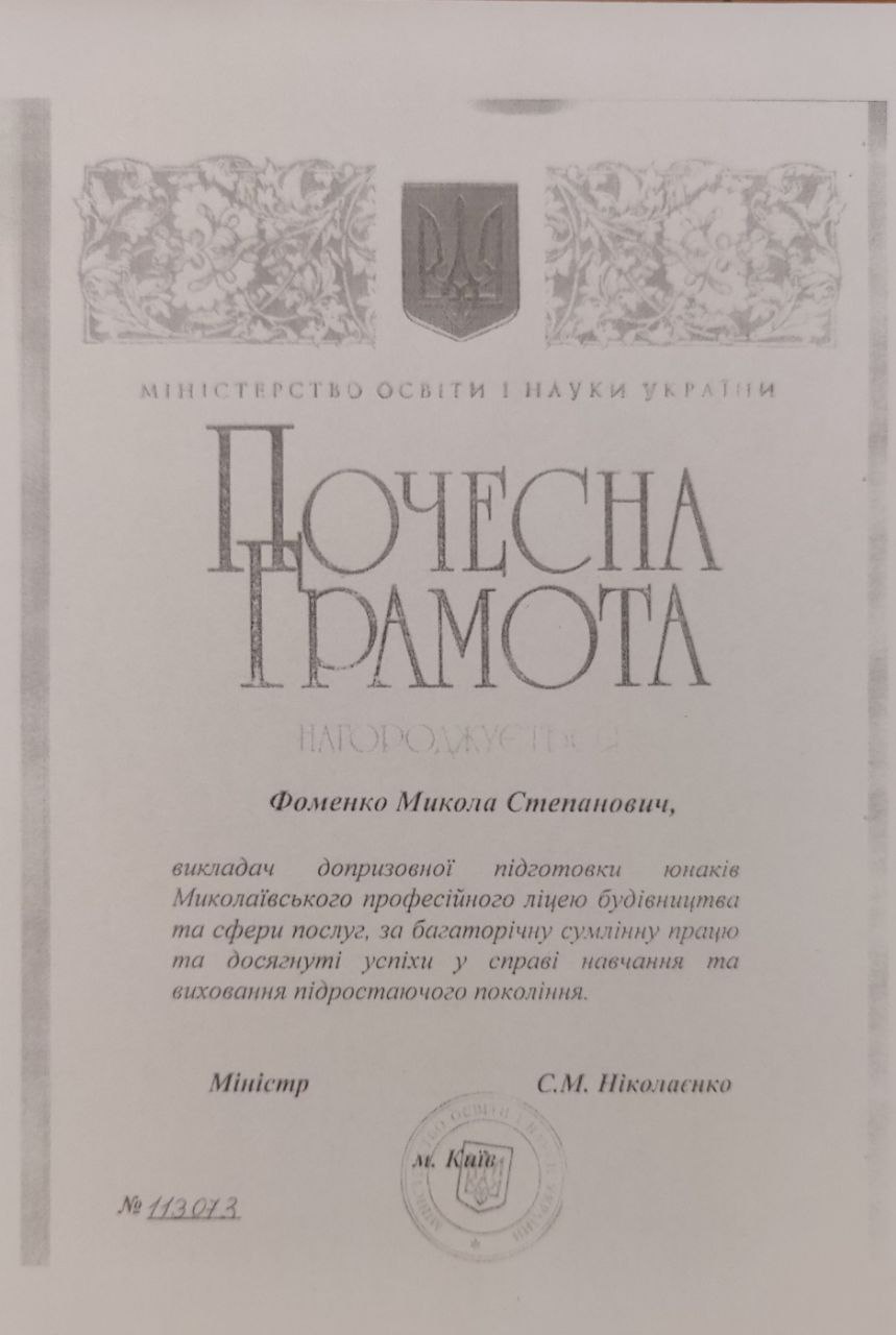 Це лише маленька частка великої кількості нагороджень, які були вручені Миколі Фоменку особисто, або членам колективу та вихованцям за результатом роботи прекрасного викладача.