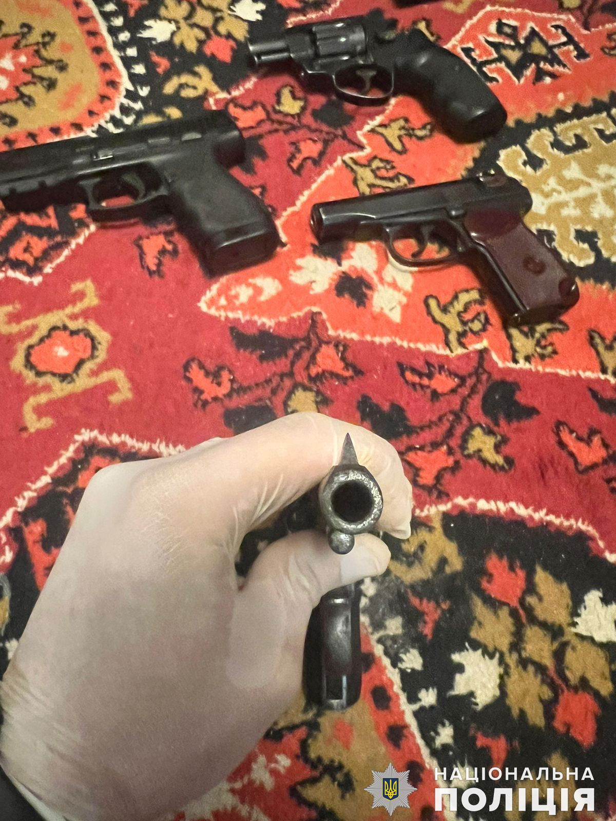 Під час проведення обшуків за місцем мешкання зловмисників правоохоронці виявили та вилучили два пістолети іноземного виробництва, два револьвери, пістолет Макарова, ще два пістолети з ознаками переробки, два корпуси гранати Ф-1 і підривачі до них та понад 300 патронів різного калібру.