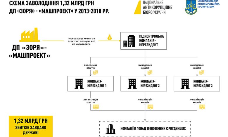 Чотирьом екскерівникам державного підприємства «Науково-виробничий комплекс газотурбобудування «Зоря» – «Машпроект» та директору приватної компанії-нерезидента 26 вересня оголосили про підозру у заволодінні у складі організованої групи коштами ДП на суму 62 мільйони доларів США (1,32 мільярди гривень за курсом НБУ на момент вчинення злочину).