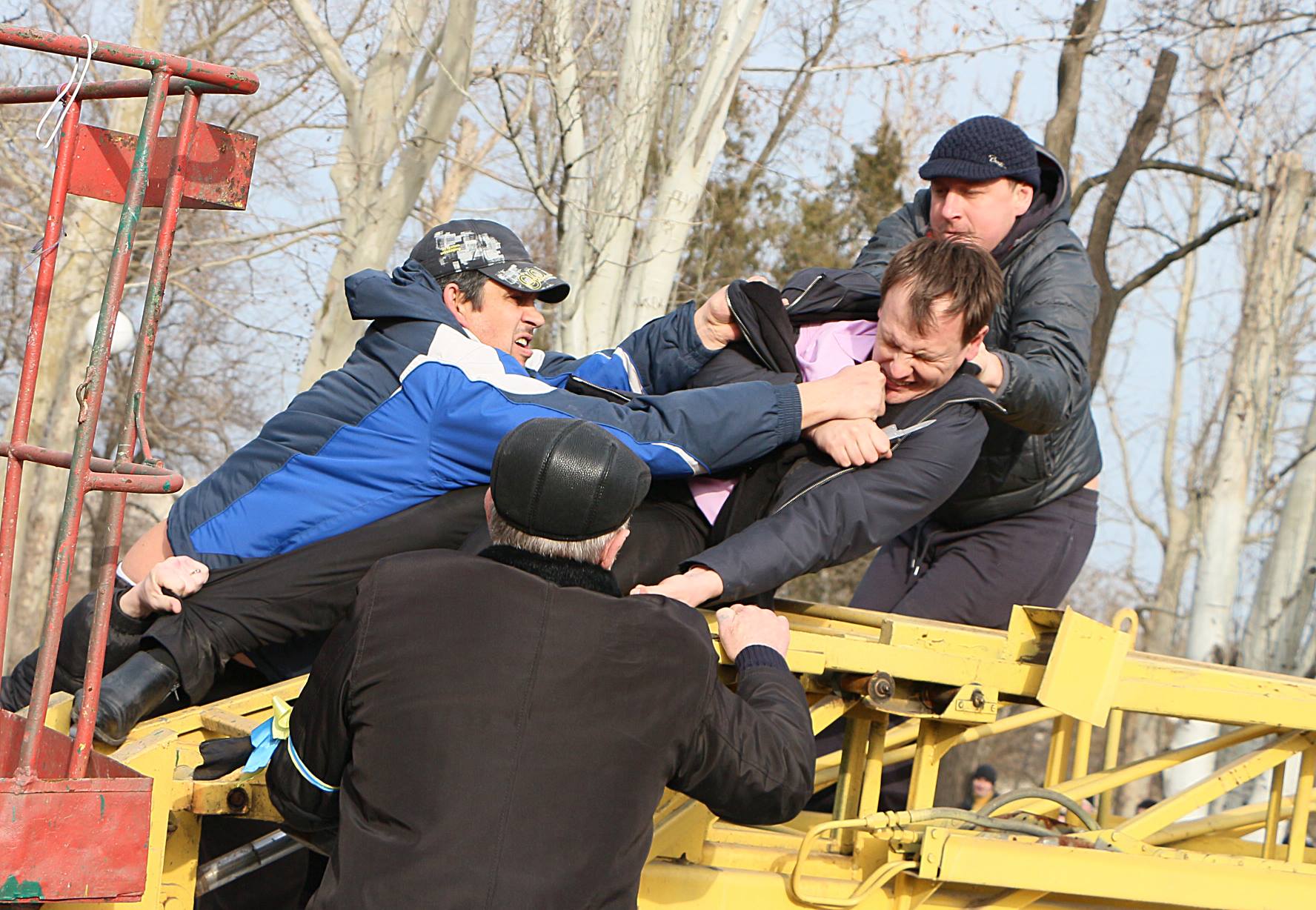 Олександр Янцен б’є комуніста Пучкова, що заважав демонтажу пам’ятника Леніну
