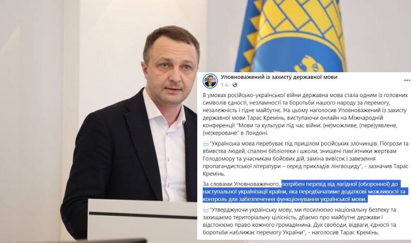 Мовний омбудсмен України Тарас Кремінь вважає, що потрібен перехід від лагідної (оборонної) до наступальної українізації країни, яка передбачатиме додаткові можливості та контроль для забезпечення функціонування української мови.