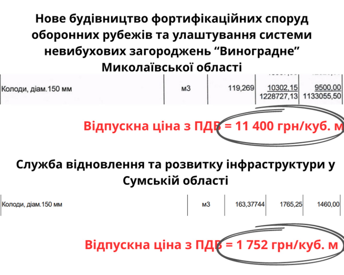 Колоди для цього об’єкту коштують 1,5 млн грн, а їхня ціна 11 400 грн за кубометр втричі вища від ринкових цін.