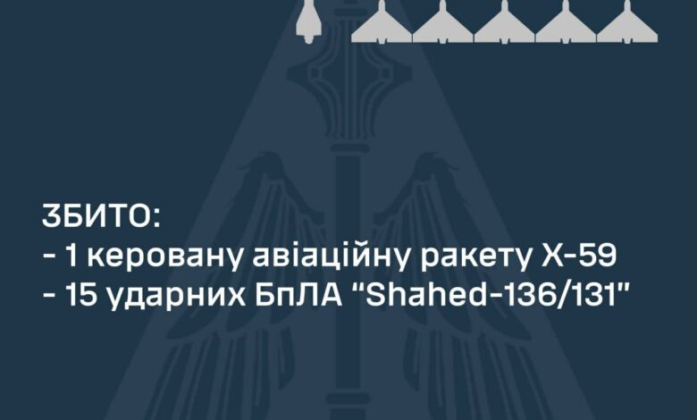 В результаті протиповітряного бою збито одну керовану авіаційну ракету Х-59 та 15 ударних БпЛА типу «Shahed».