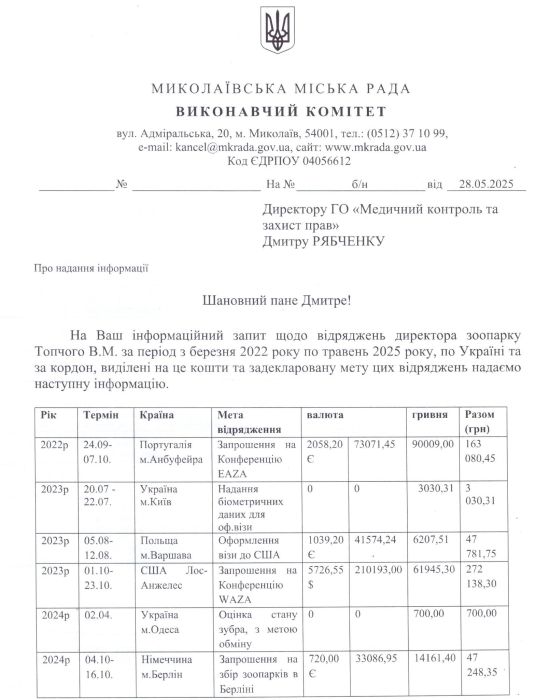 Згідно з документом, за період з березня 2022 року по травень 2025 року директор зоопарку мав такі відрядження: