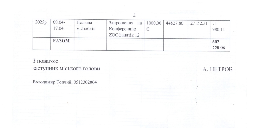 У 2025 році з 8 по 17 квітня він був у Польщі, м. Люблін, на конференції ZOOфанатік 12 (71980,11 грн).