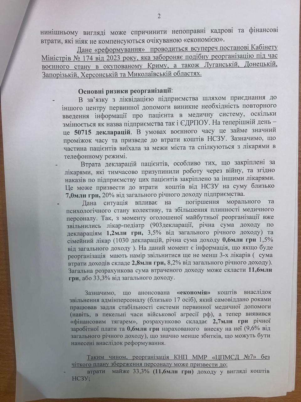 Втрати вже відбуваються: через загальний моральний стан колективу через майбутню реорганізацію з поліклініки звільнилися педіатр і сімейний лікар, що вже призвело до втрати 1,8 млн грн фінансування. Ще троє лікарів заявили про намір звільнитися, якщо об’єднання таки відбудеться — це ще 2,8 млн грн втрат. Загалом ЦПМСД №7 втратить близько 12 млн грн фінансування від НСЗУ.