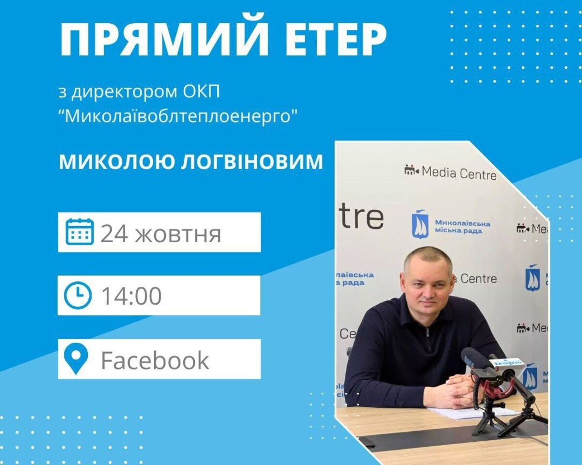 У п’ятницю, 24 жовтня 2025 року, відбудеться прямий етер директора ОКП “Миколаївоблтеплоенерго” Миколи Логвінова, під час якого він розповість про роботу підприємства та підготовку до опалювального сезону.