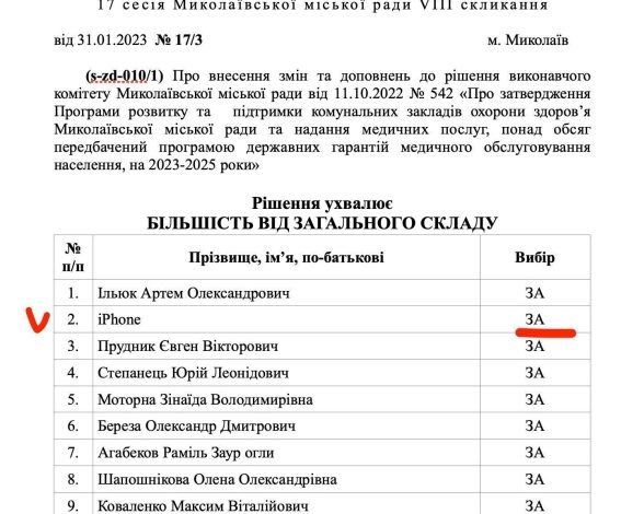 Ряд рішень Миколаївської міської ради було ухвалено за участю депутата з ім’ям iPhone — саме так зазначено в офіційних документах.
