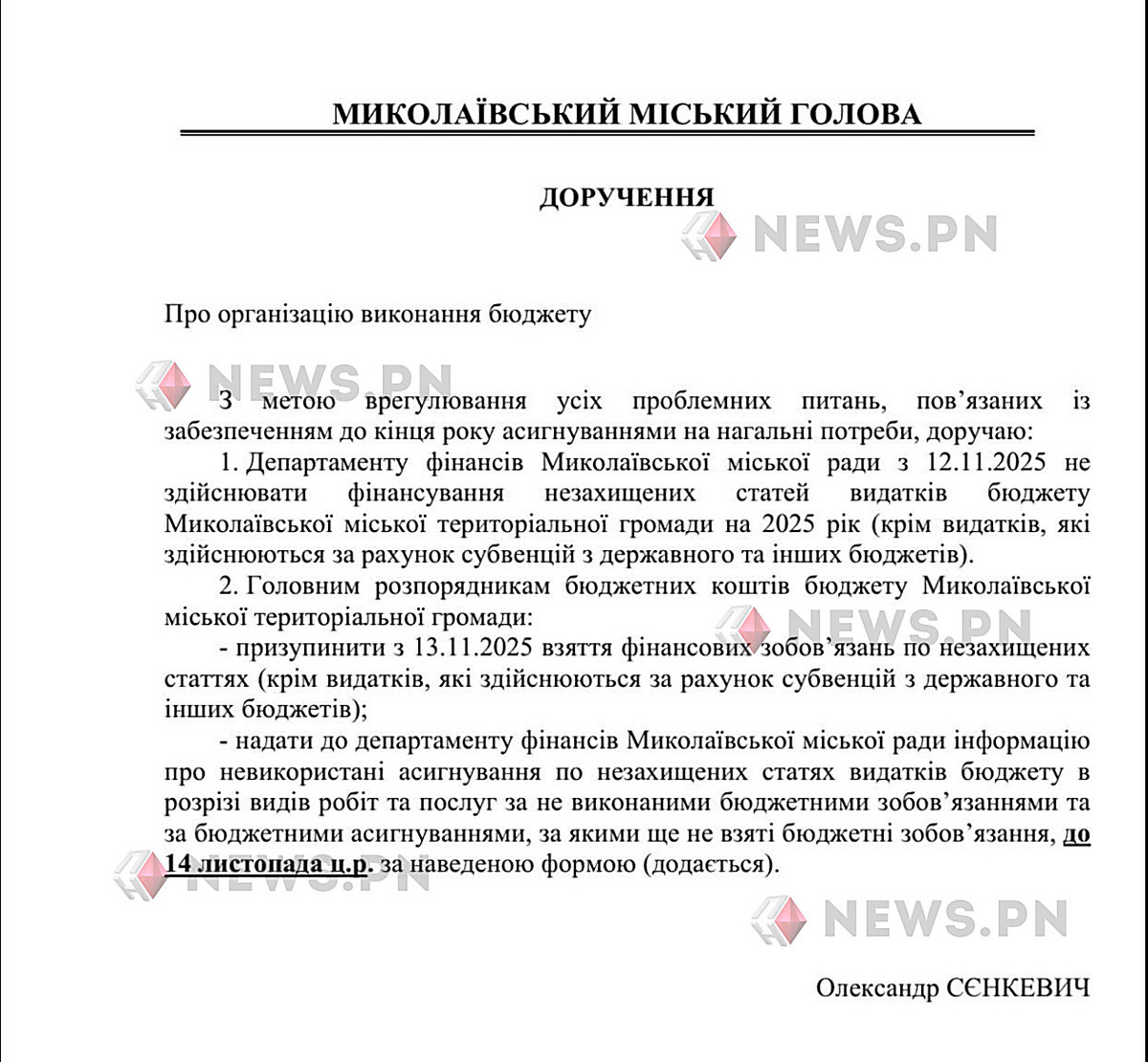 Згідно з документом, департамент фінансів із 12 листопада зупиняє оплату всіх видатків, які не належать до обов’язкових — передусім тих, що не фінансуються за рахунок державних субвенцій.