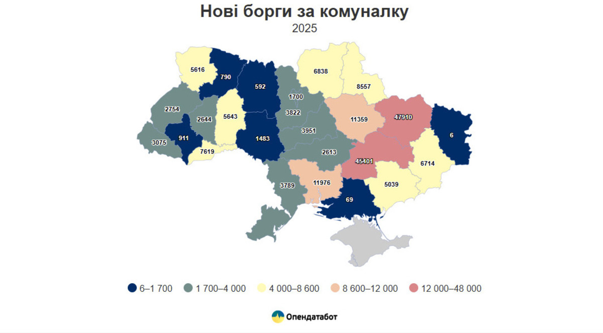 Миколаївщина загалом посідає 4-те місце серед регіонів за масштабами комунальної заборгованості: лише у 2025 році в області відкрито 11,9 тисячі таких проваджень.