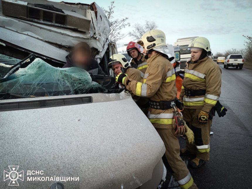 За інформацією, яку надали рятувальники ДСНС Миколаївської області, удар був настільки сильним, що водія мікроавтобуса буквально затисло в понівечених металевих конструкціях.