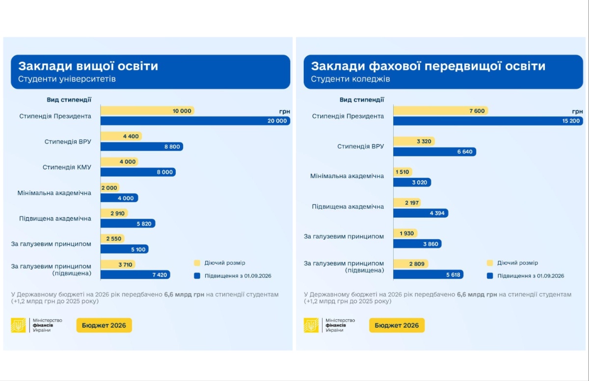 - Стипендія Президента України: з 10 000 грн → 20 000 грн/міс