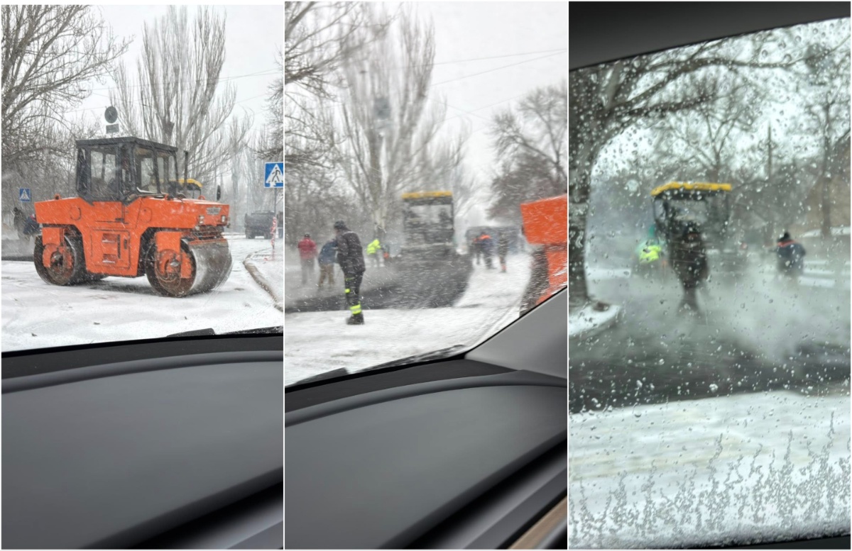 На кадрах з його допису чітко видно, як спецтехніка працює в умовах справжньої зимової бурі, а гарячий асфальт укладається на мокру та холодну поверхню, що є грубим порушенням усіх можливих норм.