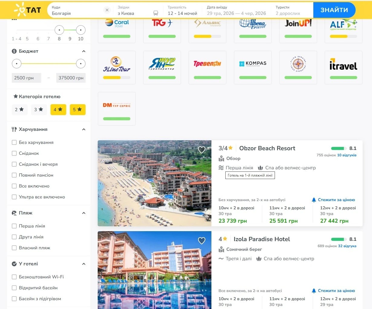 Операторів, курортів, готелів і варіантів автобусних рейсів багато. Максимально повну інформацію в реальному часі можна отримати на так званих сайтах «агрегаторах». Такі сайти по обраним параметрам пошуку опитують бази даних операторів і показують ВСІ пропозиції турів. На нашу думку, кращий з них – сайт мережі туристичних агентств Tours & Tickets tat.ua. На цій сторінці знаходяться автобусні тури в Болгарію. Тут ви знайдете багато зручних фільтрів: рейтинги готелів, курорти, дати, відгуки, дуже важливо – міста виїзду, тощо.