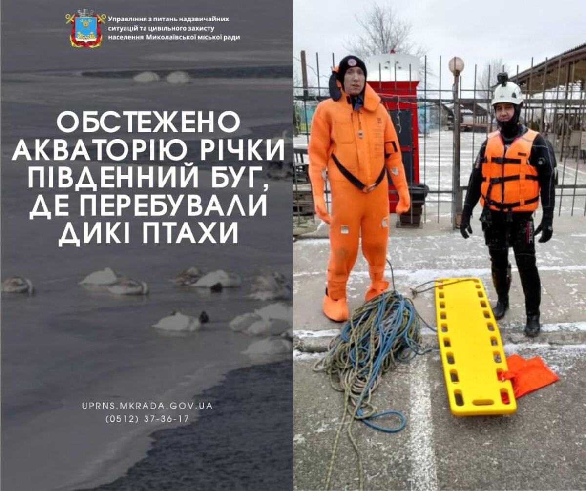 Після звернення небайдужих громадян до Contact center Миколаївської міської ради щодо надання допомоги птахам у річковій акваторії рятувальники негайно вирушили на річку Південний Буг. Там у кригу вмерз лебідь, який не міг самостійно вибратися. Як зазначають фахівці, частина водоплавних птахів не мігрує і залишається на водоймах узимку. Однак за несприятливих погодних умов вони часто опиняються у небезпеці та потребують допомоги людини.