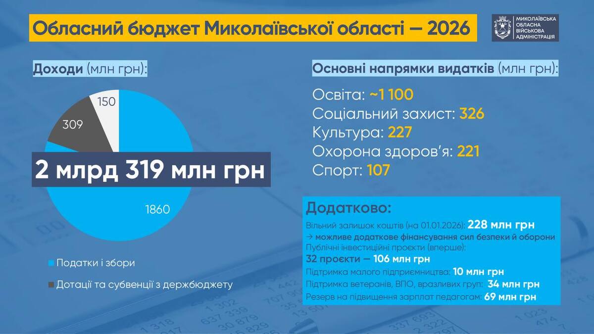 У Миколаївській області затвердили обласний бюджет на 2026 рік у розмірі 2 млрд 319 млн грн, що на 8% більше, ніж торік. Про це повідомив голова Миколаївської обласної військової адміністрації Віталій Кім, наголосивши на «реалістичному плануванні» та зростанні власних податкових надходжень на 10%. Пріоритетами бюджету визначені безпека й оборона, освіта, соціальний захист і медицина.