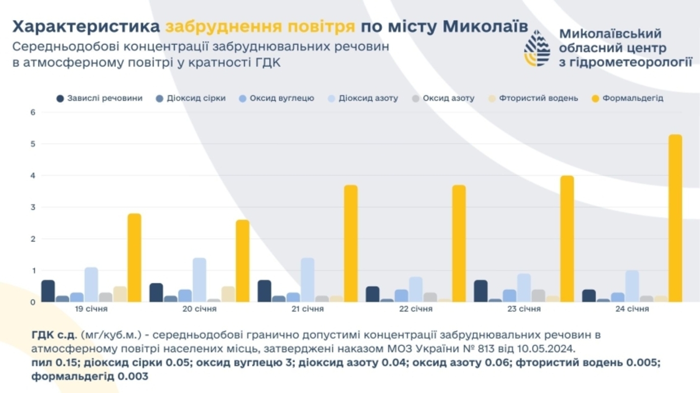 У гідрометеоцентрі зазначають, що формальдегід уже багато років залишається основним забруднювачем атмосферного повітря в Миколаєві. Така тенденція має хронічний характер і регулярно фіксується під час екологічних спостережень, незалежно від пори року.