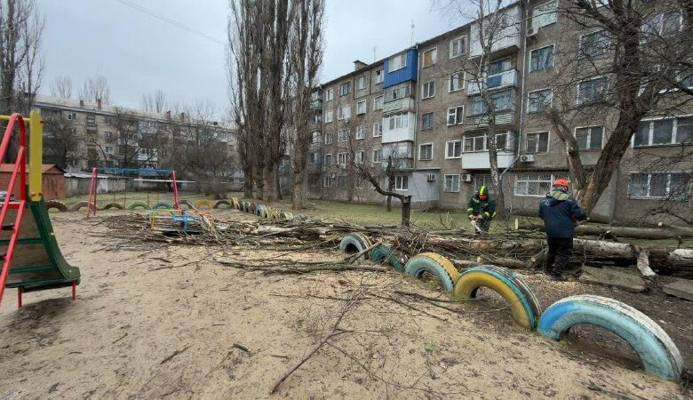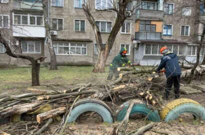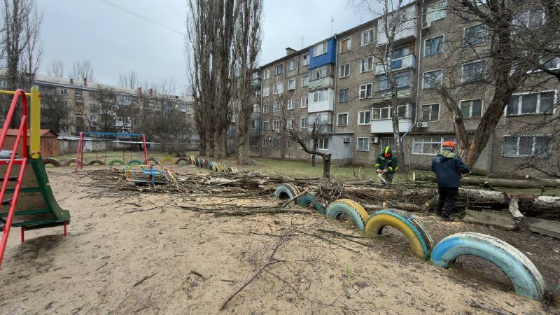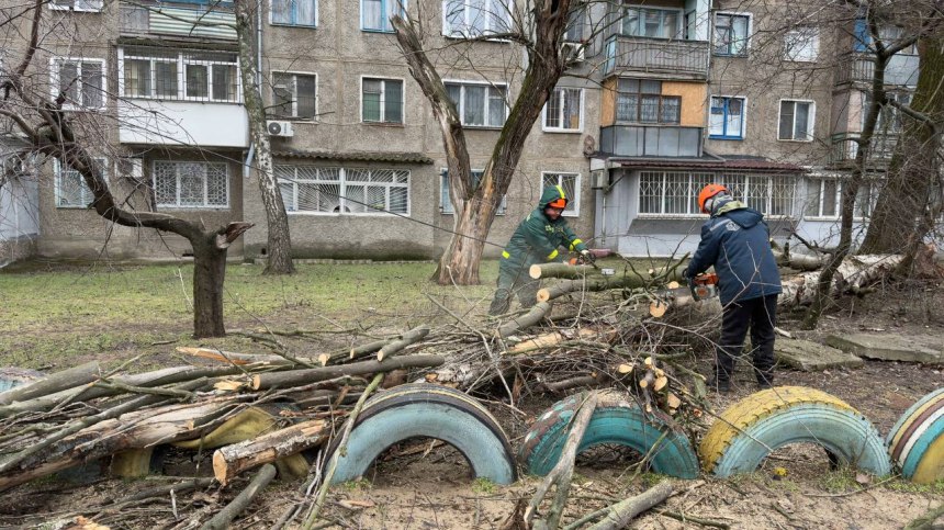 Комунальники розпилюють повалені дерева й великі гілки, прибирають дрібні уламки, завантажують та вивозять деревину; окрема увага приділяється відновленню безпечного руху для мешканців і розблокуванню тротуарів та входів на дитячі майданчики.