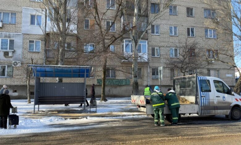 Працівники посипають протиожеледні матеріали, прибирають алеї й укріплюють підходи до зупинок і громадських зон