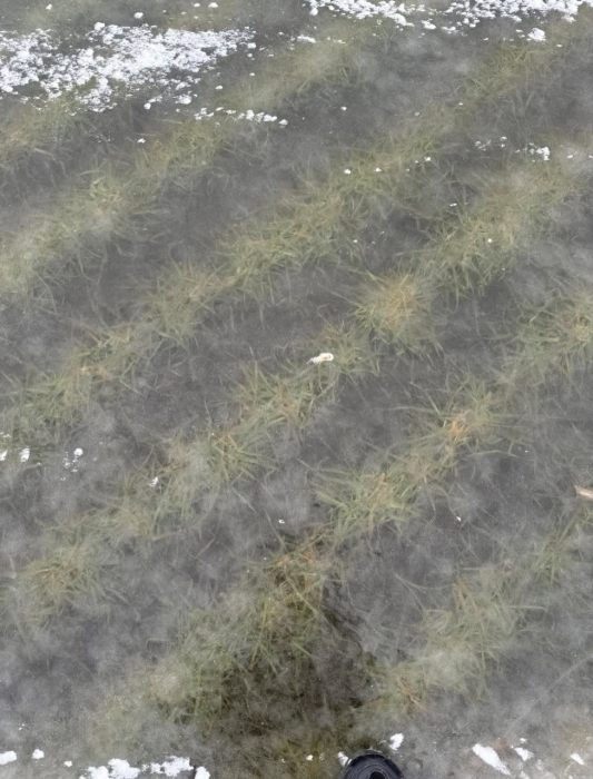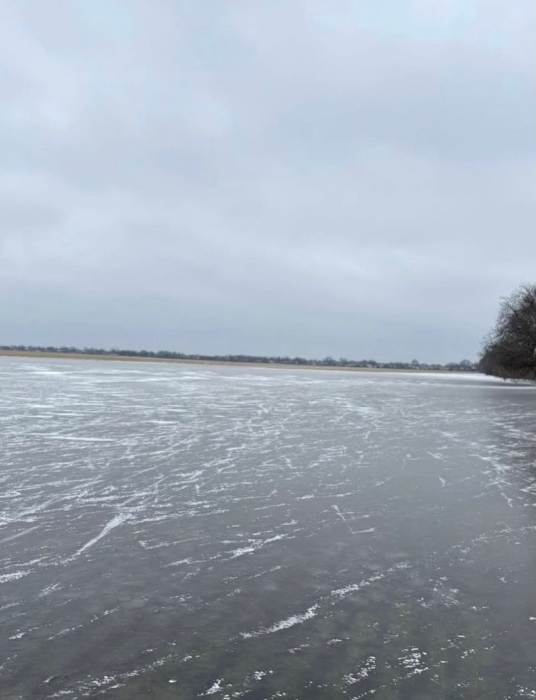 У публікації йдеться, що опади та подальше замерзання води на полях створили рівномірну крижану поверхню, яка на світлинах нагадує замерзлі водойми. Джерело ілюстрацій — акаунт ozo_com_ua у Threads, зазначають автори матеріалу.
