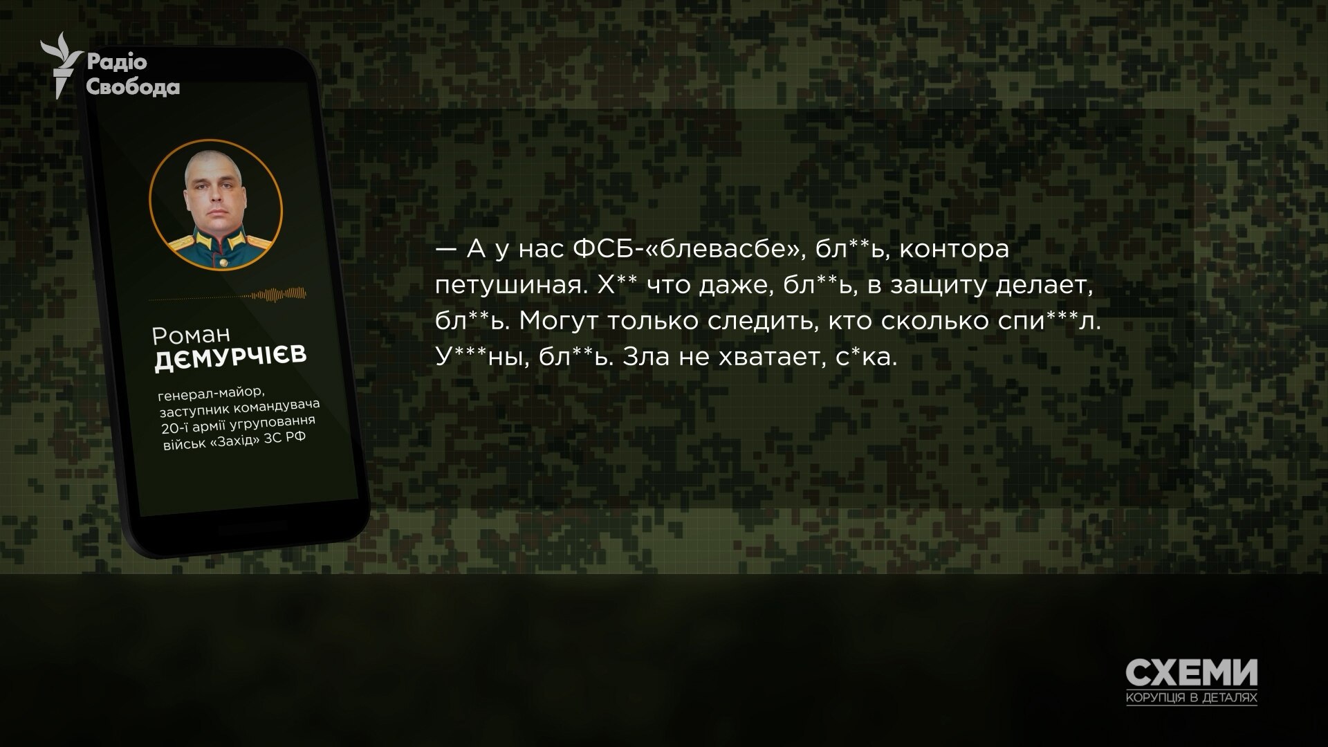 Проєкт “Схеми” від Радіо Свобода опублікували 20 лютого 2026 року дані переписок генерал-майора рф Романа Дємурчієва. Нині він, за даними журналістів, у статусі заступника командувача 20-ї загальновійськової армії у складі угруповання “Захід” зс рф допомагає керувати підрозділами, які воюють, зокрема, на Лиманському напрямку в Україні.