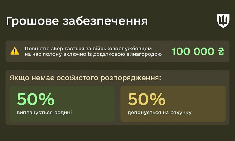 Одразу після встановлення факту перебування у полоні військовий отримує одноразову грошову допомогу у розмірі 100 000 гривень. Додатково держава виплачує щорічну підтримку — по 100 000 гривень за кожен повний рік, проведений у полоні. На час неволі за військовим зберігається грошове забезпечення, яке може спрямовуватися родичам або депонуватися на особистому рахунку до моменту повернення.